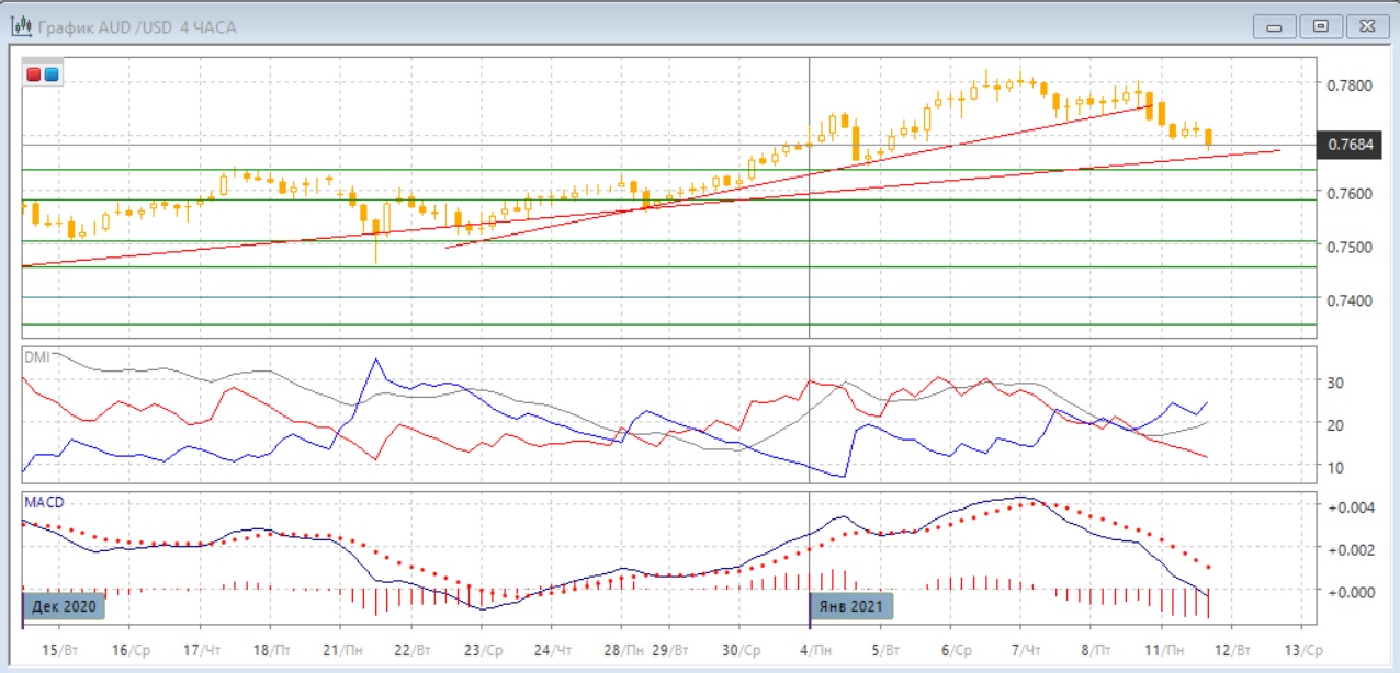 На четырёхчасовом графике пара перешла к снижению. Относительные максимумы и минимумы пары последовательно снижаются. Снижение ускорилось после преодоления 8 января краткосрочной линии тренда с конца декабря. По индикаторам направленного движения тенденцией является снижение: превышение DM- над DM+ увеличивается, гистограмма MACD снижается в отрицательной зоне, линия MACD имеет отрицательный наклон. Пара близка к более долгосрочной линии тренда и важному в этом масштабе уровню поддержки 0,7635.