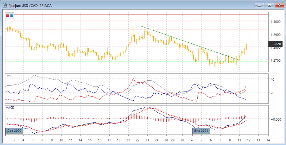 На четырёхчасовом графике рост стал сильной тенденцией по индикаторам направленного движения: превышение DM+ над DM- большое и увеличивается, уровень ADX восстановился, гистограмма MACD растёт в положительной зоне, линия MACD имеет положительный наклон. Преодоление уровня максимумов начала января и "круглого" уровня 1,2800 открывает пространство для дальнейшего роста до следующего "круглого" уровня 1,2900 и сопротивления на 1,2930. Относительные максимумы и минимумы пары сейчас последовательно растут.