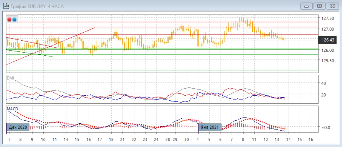 На четырёхчасовом графике остановка у уровня 126,70 завершилась тем, что пара перешла к снижению и уровень 126,70 выступил уже сопротивлением при отскоках вверх 13 января. Преодоление уровня открывает пространство для движения к следующему уровню поддержки на 12600 - до этого обоснованных уровней для поддержки не видно.