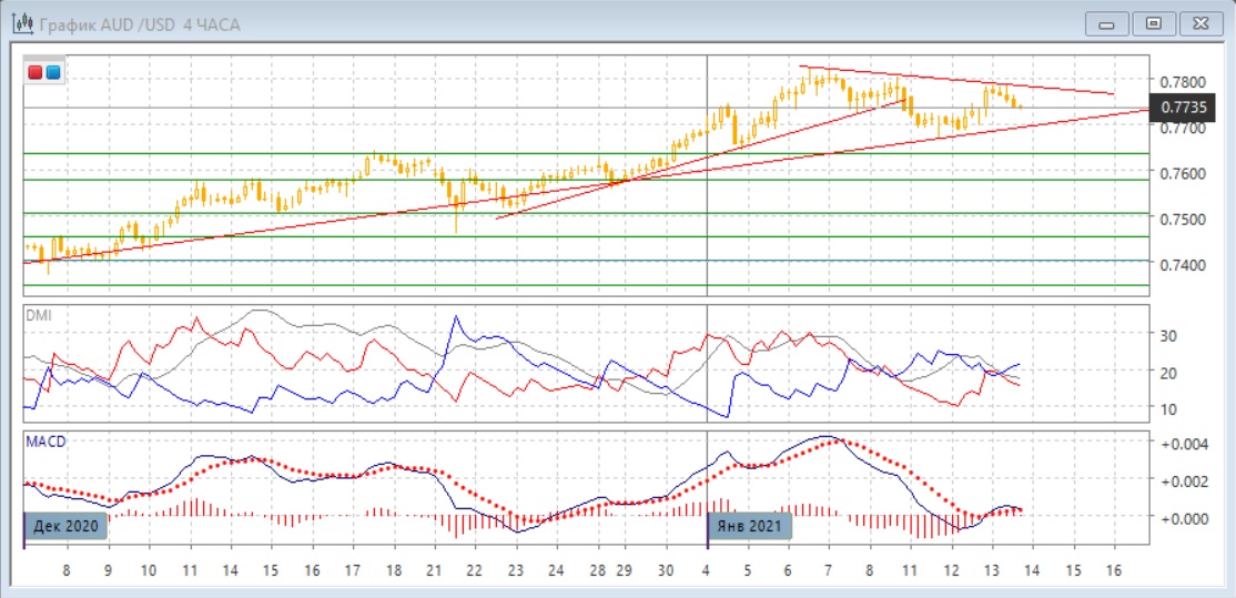 На четырёхчасовом графике пара продолжает снижение. Относительные максимумы и минимумы пары последовательно снижаются. После образования нового относительного максимума ниже 0,7800 более вероятным видится возврат к более долгосрочной линии тренда и "круглому" уровню 0,7700, где была поддержка 11-12 января. По индикаторам направленного движения пара примерно во флэте: DM- и DM+ близки, гистограмма MACD около нуля.