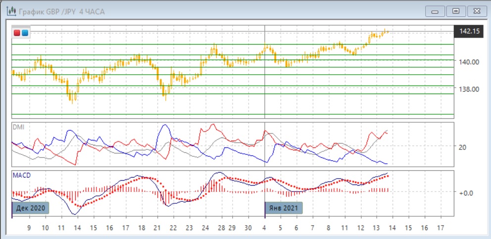 На четырёхчасовом графике пара вышла вверх из более узкого диапазона 139,50-141,00, и она находится уже не так далеко от цели измеренного движения, равного размеру диапазона 142,50. Рост пары замедляется, это видно по образованию медвежьего расхождения максимумов пары и гистограммы MACD, однако разворота не было, и выход пары из как более широкого, так и из более узкого диапазонов вверх делает продолжение роста более предпочтительным, даже если произойдёт откат. По ADX тенденция роста стала сильной: превышение DM+ над DM- большое, ADX на высоком уровне.