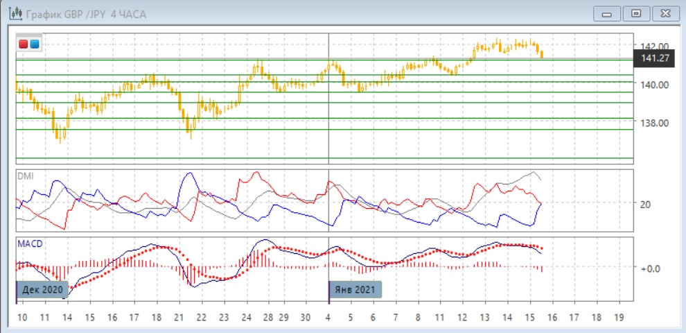 На четырёхчасовом графике после образования рада свечей дожи пара снизилась от уровня 142,00 и теперь находится около уровня 141,20 - у максимумов 24 декабря и 4, 8 января. В случае преодоления этого уровня пара может достигнуть нижней границы диапазона в конце декабря и начале января 139,50-141,00. Снижение от 142,00 было относительно сильным, если сравнивать с откатами от 141,00. Это предполагает, что в краткосрочной перспективе снижение может продолжиться.
