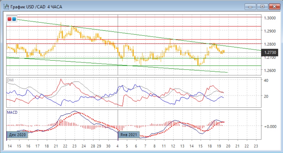 На четырёхчасовом графике пара снизилась от "круглого" уровня 1,2800, зоне поддержки находится на 1,2690-1,2700. Если рассматривать движение в канале 1,2630-1,2800, то снижение является более предпочтительным, так как пара снижается от верхней границы. По индикаторам направленного движения в этом близкая к флэту ситуация: DM+ и DM- пересекаются, гистограмма MACD колеблется около нуля. Исходя из движения в диапазоне новое тестирование уровня 1,2690 выглядит более вероятным, чем возвращение к 1,2800 на данный момент.