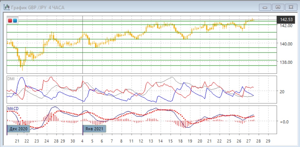 На дневном графике пара находится выше сопротивления на 142,00, и если пара закрепится выше этого уровня, открывается пространство для существенного роста, исходя из размера диапазона в декабре в 160 пунктов. Пока, однако после закрытия выше 142,00 развитие движения вверх было слабым, и это может привести к возвращению обратно в диапазон января, в выход вверх стал бы ложным пробоем. Вероятность отката увеличивается из-за образования медвежьего расхождения максимумов пары и гистограммы MACD. Однако последовательность роста относительных максимумов и минимумов пары сохраняется, уровень ADX увеличился, разрыв между DM+ и DM- большой и устойчивый. Тенденция роста может привести к преодолению предыдущих максимумов января.