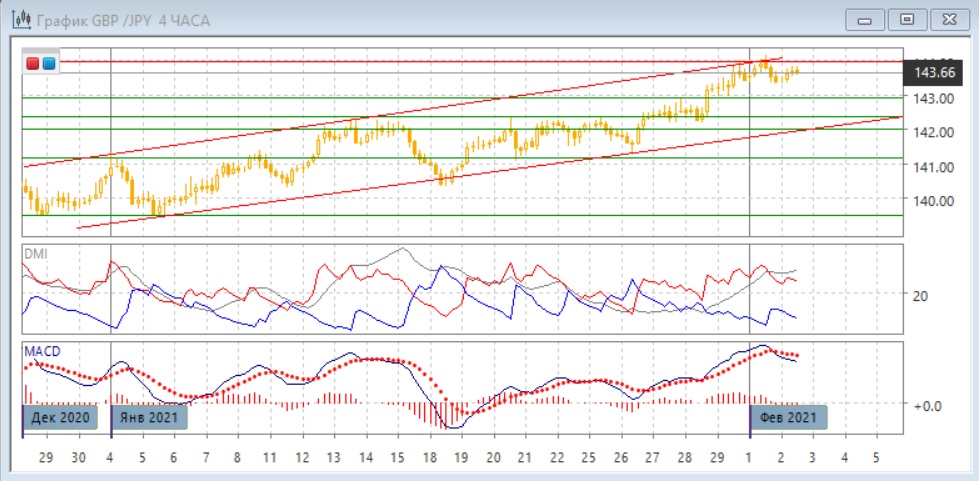 На четырёхчасовом графике тенденция роста также сильная, однако при приближении к верхней границе канала рост замедлился. По индикаторам направленного движения это видно по сохранению большого превышения DM+ над DM- при высоком уровне MACD, но снижению гистограммы MACD и развороту линии MACD вниз. Откат от 144,00 остаётся в пределах коррекции к росту, и более вероятным кажется, что рост возобновится. Сопротивление на 144,00, однако, сейчас укрепляется, так как там образовалось бы медвежье расхождение максимумов пары и гистограммы MACD.