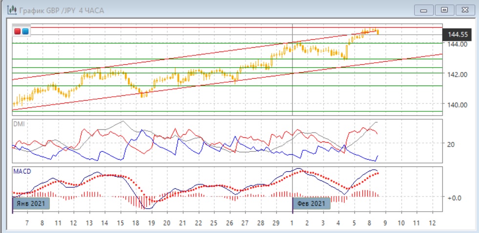 На дневном графике пара достигла нового максимума и она находится выше верхней границы восходящего канала с начала января. Это может говорить об ускорении движения. Увеличивает вероятность выхода из канала вверх то, что при снижении от верхней границы в начале февраля не была достигнута нижняя граница канала (линия тренда). Последовательность роста относительных максимумов и минимумов пары сохраняется. По индикаторам направленного движения тенденцией является рост: превышение DM+ над DM- очень большое и увеличивается, ADX на высоком уровне, положительный наклон линии MACD сохраняется, гистограмма MACD находится в положительной зоне. Пара находится близко к максимумам января-февраля 2020 г. у 145,00. Преодоление и этого уровня открыло бы пространство для движения к максимуму декабря 2019 г. у 148,00.
