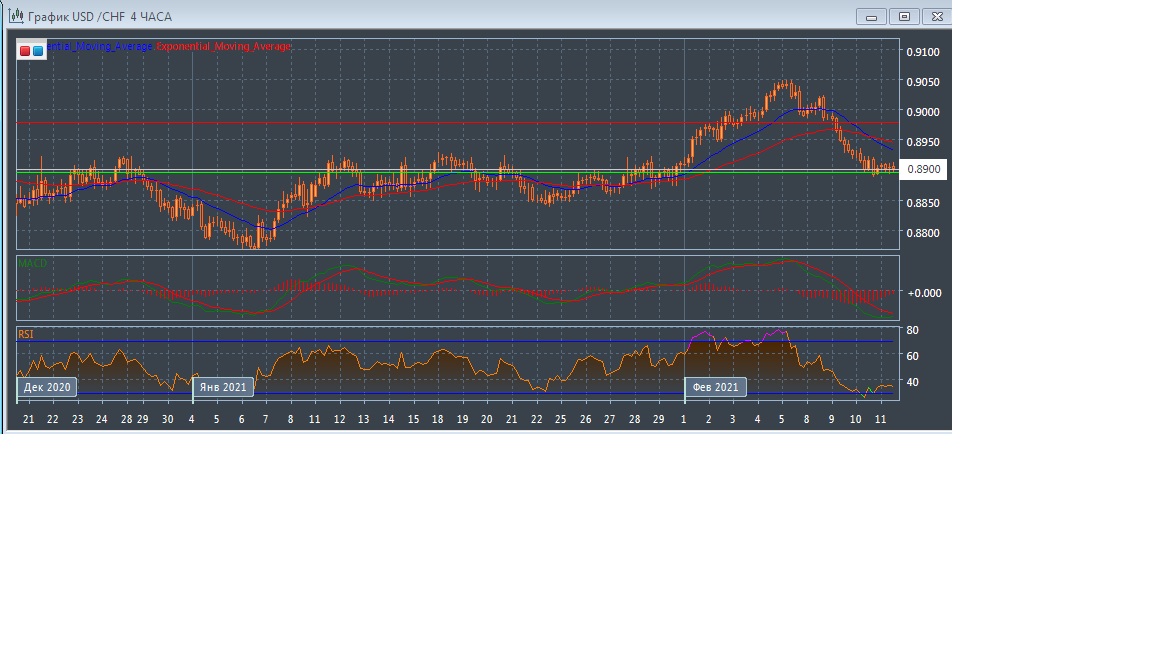 На четырёхчасовом графике скользящие средние с периодом 21 и 55 дней продолжают движение вниз, ускоряются и теперь увеличивают расхождение, что говорит о медвежьем сценарии этого рынка. График находится в области ниже экспоненциальных скользящих средних, что так же демонстрирует медвежий потенциал данного рынка в краткосрочной перспективе.
