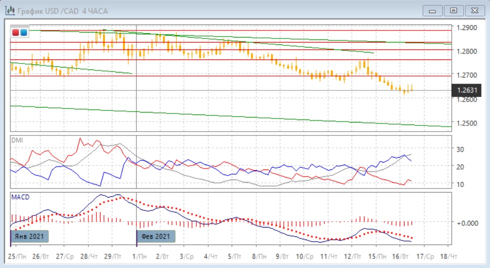 На дневном графике пара преодолела важный уровень поддержки 1,2690, при этом отскока от уровня не произошло. Пара находится у следующего "круглого" уровня 1,2600 и поддержки на 1,2630. В этой зоне находятся минимумы января, и поддержка здесь выглядит обоснованной. С другой стороны, если представить движение не в диапазоне, а в нисходящем более широком канале с декабря, то цель на нижней границе сейчас находится около 1,2480, это соответствует следующему "круглому" уровняю 1,25000, он, вероятно, будет важен и психологически. Для того, чтобы риск немедленного отскока вверх уменьшился, необходимо закрытие ниже 1,2630. По индикаторам направленного движения сохраняется флэт: ADX на очень низком уровне и снижается, DM+ и DM- близки, по более краткосрочным индикаторам тенденцией является снижение (вероятно, в рамках консолидации): гистограмма MACD снижается в отрицательной зоне, линия MACD имеет отрицательный наклон.