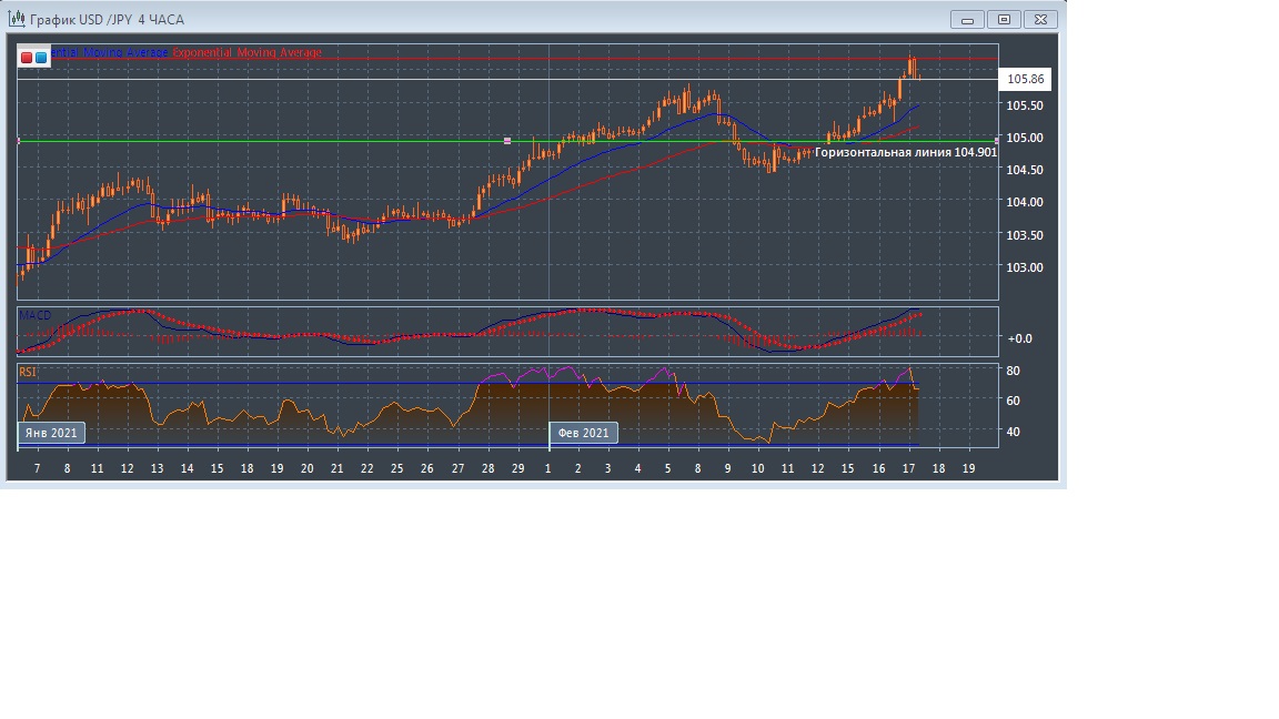 Скользящие средние с периодом 21 и 55 дней продолжают движение вверх и ускоряются увеличивая расхождение, что является признаком укрепления восходящего тренда данного рынка в краткосрочной перспективе. Четырёхчасовой график прогрессирует значительно выше экспоненциальных скользящих средних, демонстрируя уверенный бычий потенциал рынка в краткосрочной перспективе.