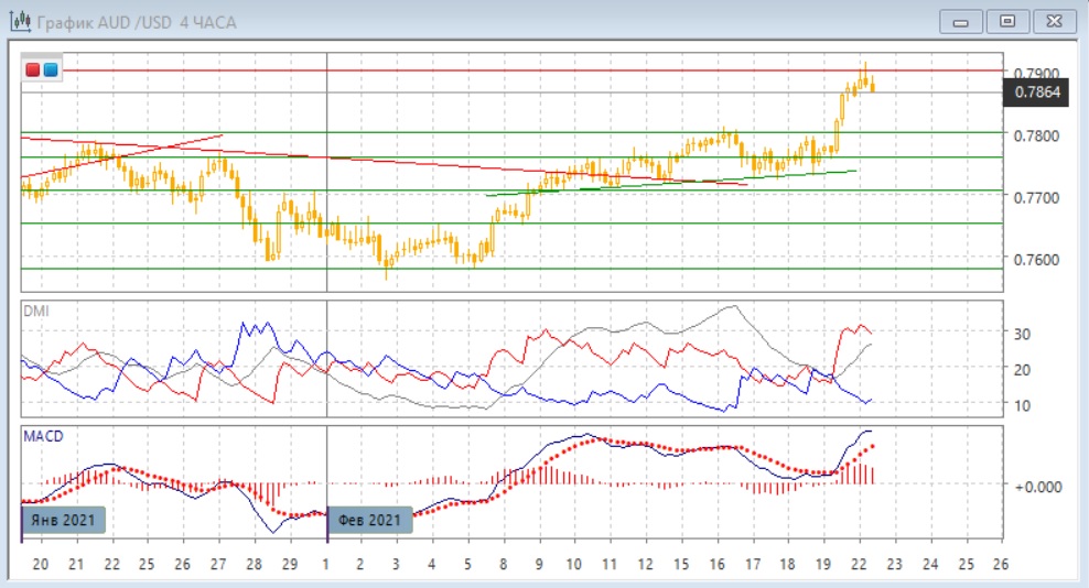 На четырёхчасовом около 0,7900 образовались свечи с верхними тенями. Движение выше продаётся, и, кажется, откат сейчас вероятен - особенно учитывая величину волна роста от краткосрочной линии тренда с 18 февраля - почти 200 пунктов. Однако даже если откат будет, очевидно, что рост является сильной тенденцией и, вероятно, возобновится. По ADX тенденция очень сильная: превышение DM+ над DM- очень большое при относительно высоком уровне ADX.