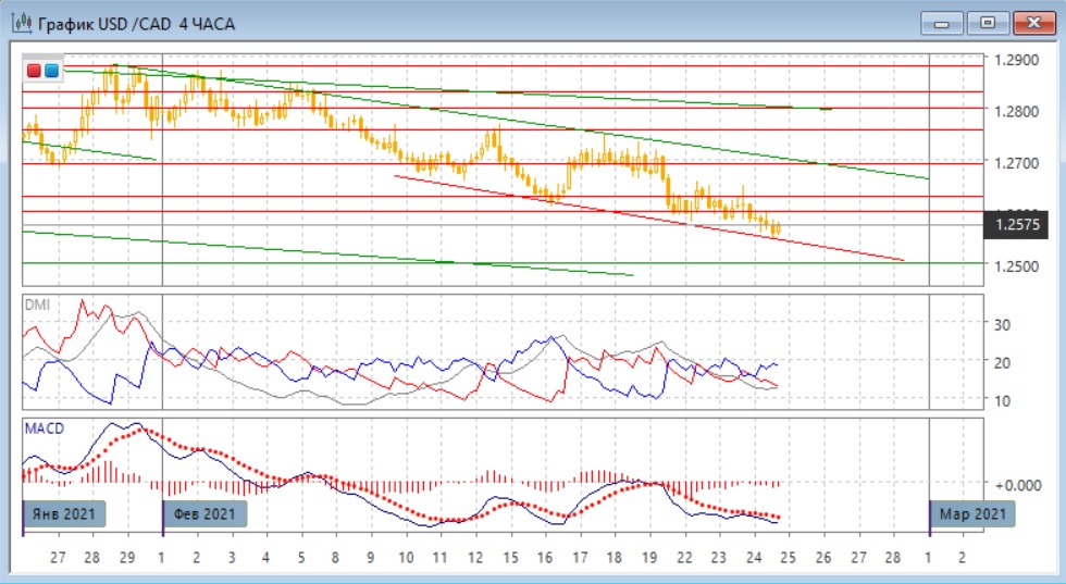 На дневном графике пара продолжает снижаться в рамках более широкого нисходящего канала с декабря и, ближе, от краткосрочной линии нисходящего тренда в феврале. Пара закрепилась ниже важного уровня 1,2630 (поддержка в январе, что открывает пространство для дальнейшего снижения. Исходя из движения пары между "круглыми" уровнями, целью видится 1,2500 - это психологически важный уровень, и пара может найти там сильную поддержку, по крайней мере поначалу. По индикаторам направленного движения тенденцией является снижение: уровень ADX остаётся низким, но он вырос, разрыв DM- с DM+ увеличился, гистограмма MACD находится в отрицательной зоне, линия MACD имеет отрицательный наклон.