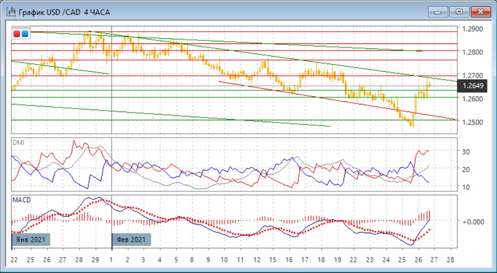 На дневном графике пара восстановилась почти до краткосрочной линии тренда (верхняя граница канала в феврале). В более широкой перспективе, однако, пара остаётся в нисходящего канале с декабря. Закрытие выше зоны 1,2600-1,2630, на которой были минимумы в январе и с середине декабря, может сделать снижение ниже этого уровня на этой неделе ложным прорывом, и сделать более вероятным более значительный отскок вверх, возможно, до верхней границы нисходящего канала с декабря у 1,2800. По индикаторам направленного движения тенденцией остаётся снижение: разрыв DM- существенно выше DM+, гистограмма MACD, несмотря на повышение, находится в отрицательной зоне, линия MACD имеет отрицательный наклон.