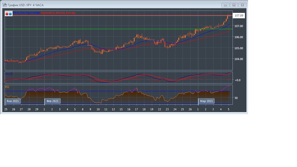 Скользящие средние с периодом 21 и 55 дней продолжают двигаться вверх, увеличивая расхождение, что является признаком восходящего тренда данного рынка в краткосрочной перспективе. Четырёхчасовой график прогрессирует заметно выше экспоненциальных скользящих средних, демонстрируя развитие восходящего потенциала этого рынка в краткосрочной перспективе.