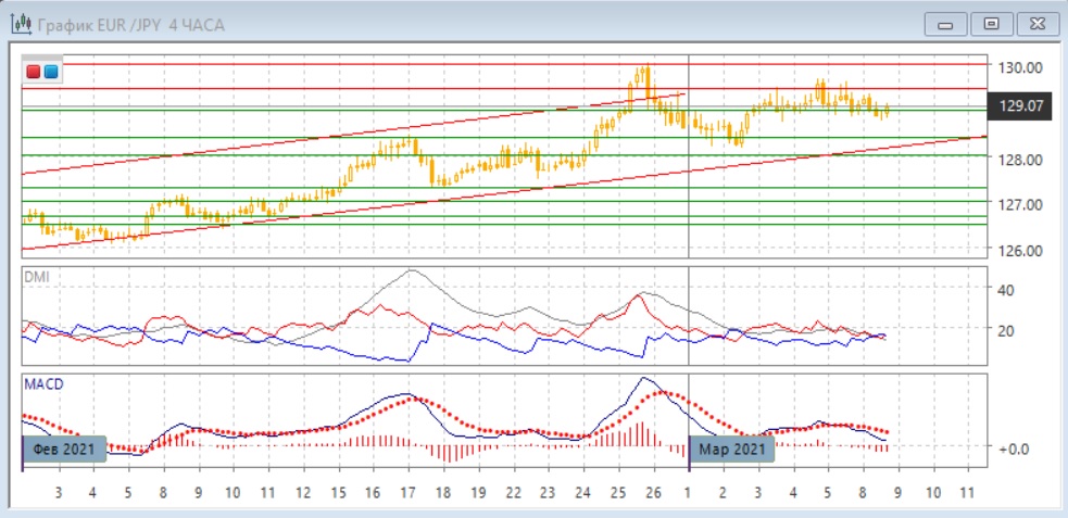 На четырёхчасовом графике пара после консолидации в границах 129,00-129,45, возможно, преодолевает уровень поддержки. Ранее можно 3-5 марта можно представить плоскую вершину, в таком случае выход ниже 129,00 был бы подтверждением При снижении пара может получить поддержку на линии тренда (нижняя граница канала) и уровне 128,40, которые будут близко. По более краткосрочным индикаторам направленного движения пара снижается: гистограмма MACD снижается в отрицательной зоне, линия MACD получила отрицательный наклон.