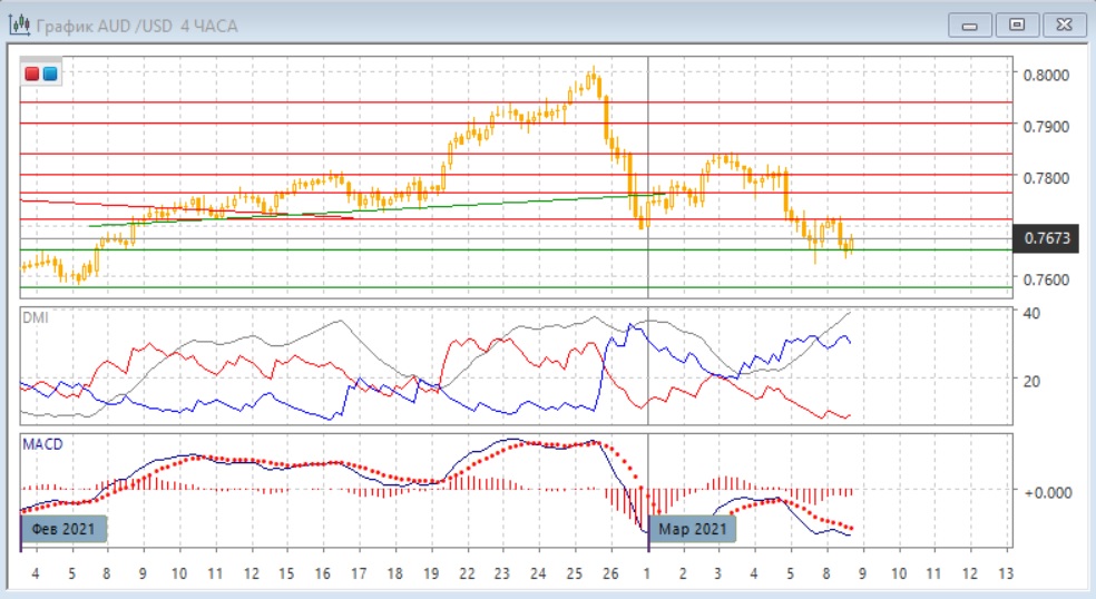 На дневном графике пара остаётся в относительно узкой консолидации с начала марта, нижняя граница которой - сильная зона поддержки 1,2600-1,2630, а верхняя граница - уровень сопротивления 1,2690. После образования "молота" в четверг в пятницу образовалась "падающая звезда", это пока стабилизация продолжается. Дальнейшее более значительное движение скорее будет в направлении выхода из консолидации.