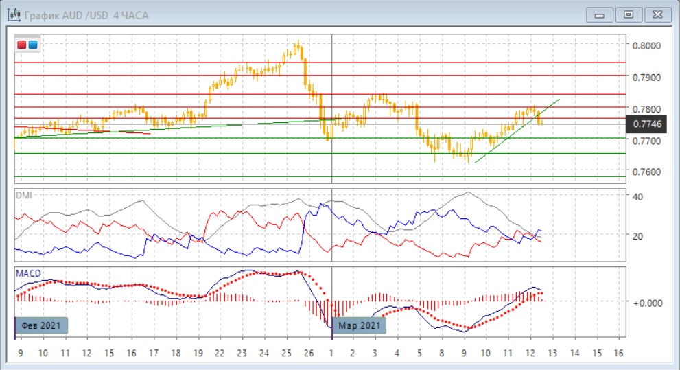 На четырёхчасовом графике пара также снизилась от "круглого" уровня, при этом преодолела поддержку на 0,7765, которая проявилась 12 марта, и краткосрочную линию тренда, если строить её с 9 марта. При развитии отката целью видится следующий "круглый" уровень 0,7700, это ближайшая обоснованная поддержка. По индикаторам направленного движения скорее нейтральная ситуация: DM- и DM+ пересекаются, уровень ADX снижается, снижение гистограммы MACD происходит при положительном наклоне линии MACD.