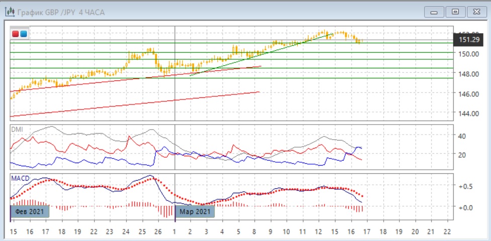 На четырёхчасовом графике разворот, возможно, уже происходит: относительные максимумы и минимумы пары снижаются, у 152 может образоваться небольшая двойная вершина, и пара уже ниже промежуточного минимума. По индикаторам направленного движения тенденцией стало снижение: DM- выше DM+, гистограмма MACD снижается в отрицательной зоне, линия MACD имеет отрицательный наклон. Исходя из размера двойной вершины, ближайшей целью может быть уровень поддержки на 150,00.