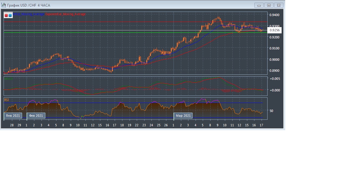 На четырёхчасовом графике скользящие средние с периодом 21 и 55 дней развернулись вниз, замедлились, сокращая расхождение, что характеризует переход рынка к медвежьему сценарию развития в рамках внутридневной торговли. График котировок прогрессирует в области чуть ниже экспоненциальных скользящих средних, подтверждая небольшой нисходящий потенциал данного рынка в краткосрочной перспективе.