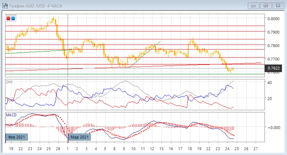 На четырёхчасовом графике пара преодолела важный в этом масштабе уровень поддержки 0,7650, от которого пара выросла в 5-8 марта. Текущий отскок в верх в среду может объясняться достижением "круглого" уровня 0,7600, так как для австралийского доллара круглые уровни обычно срабатывают как поддержка или сопротивление, хотя бы краткосрочно. Размер роста от 0,7600 невелик, и, вероятно, снижение возобновится. По индикаторам направленного движения тенденция снижения сильная: превышение DM- над DM+ очень большое, ADX на высоком уровне, гистограмма MACD в отрицательной зоне, линия MACD имеет отрицательный наклон.