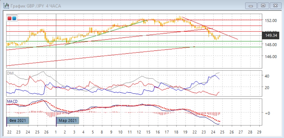 На четырёхчасовом графике пара последовательно снижается. Происходящий отскок вверх от уровня 148,40, скорее всего, является коррекционным после волны снижения, примерно равной по размеру волне с 18 марта. Относительные максимумы и минимумы пары снижаются. Пара остаётся ниже линии краткосрочного тренда, если строить её с 18 марта, и там можно ожидать ближайшего сопротивления. По индикаторам направленного движения в этом масштабе тенденция снижения сильная: DM- значительно выше DM+, ADX на высоком уровне, гистограмма MACD в отрицательной зоне, линия MACD имеет отрицательный наклон.