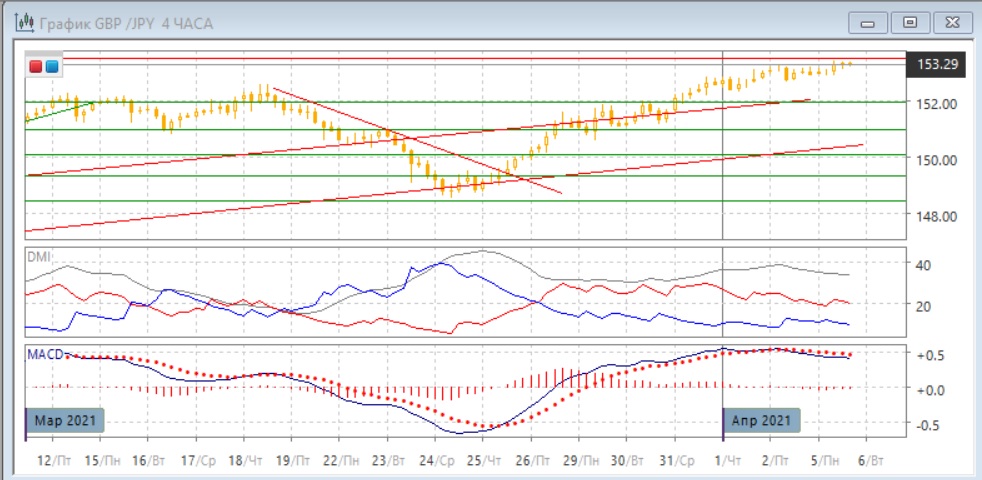 На четырёхчасовом графике рост замедляется перед 153,50. Новые максимумы не подтверждаются по гистограмме MACD. Линия MACD получила отрицательный наклон. Медвежьи расхождения образовывались и ранее в текущей волне рост с 24 марта, однако подтверждения сигнала не было. Пока рост остаётся сильной тенденцией, и идти против неё рискованно. Размер волны роста от 148,50 уже большой (почти 500 пунктов), и коррекция назревает, поэтом рассчитывать на рост в краткосрочной перспективе на текущем уровне тоже рискованно.