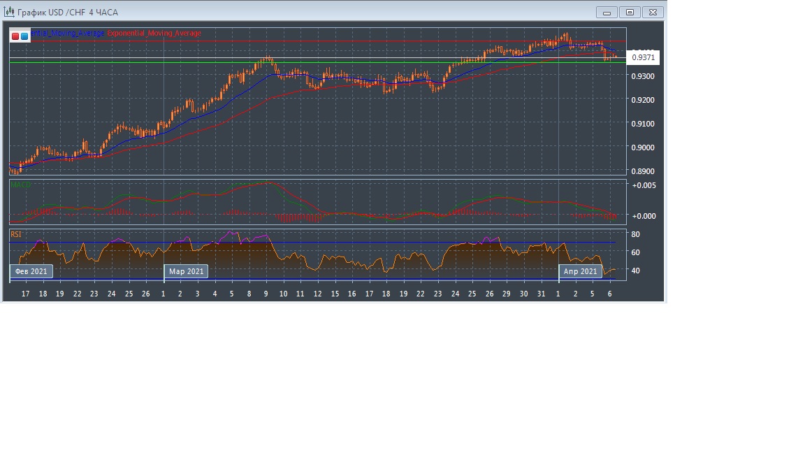 На четырёхчасовом графике скользящие средние с периодом 21 и 55 дней развернулисть вниз, сокращая расхождение, что говорит о хорошем медвежьем потенциале. Таким образом, общий тренд в краткосрочной перспективе сменился на нисходящий. График котировок прогрессирует в области чуть ниже экспоненциальных скользящих средних, подтверждая медвежий потенциал данного рынка в краткосрочной перспективе.