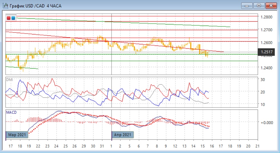 На четырёхчасовом графике пара продолжает снижение после разворота от зоны 1,2600-1,2630 13 апреля, когда образовалась разворотная свечная комбинация с "падающей звездой" у сильной зоны сопротивления. Пара достигла психологически важного уровня 1,2500, и остаётся около него. Отсутствие отскока от сильной поддержки может быть медвежьим сигналом в текущих условиях, учитывая, что сейчас сопротивлением также является верхняя граница более долгосрочного канала.