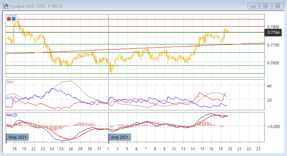 На четырёхчасовом графике пара преодолела сопротивление на 0,7765, от которого происходили откаты 15 и 16 апреля. Этот уровень в понедельник является уже поддержкой. Ближайшей целью видится тестирования следующего "круглого" уровня 0,7800, и, учитывая что тенденция роста сохраняется, пара может вырасти и выше, до следующего сильного сопротивления на 0,7840 (около максимумов в марте). По ADX рост остаётся хорошо выраженной тенденцией: DM+ существенно выше DM-, уровень ADX высокий. Образовалось медвежье расхождение максимумов пары и гистограммы MACD, но подтверждения этому сигналу не было.