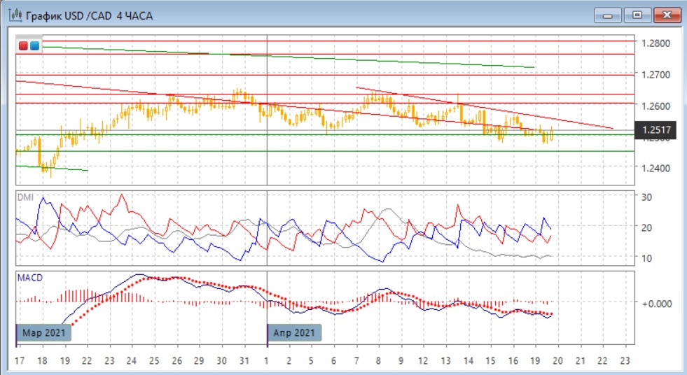 На четырёхчасовом графике пара находится у уровня 1,2500 - после снижения в начале понедельника пара восстановилась, но в целом тенденция снижения сохраняется и в этом масштабе, относительное максимумы пары постепенно снижаются с 7 апреля. Если рассматривать диапазон в апреле 1,2500-1,2630, при отскоке с 14 апреля пара выросла где-то до середины, после чего вернулась к нижней границе диапазона. Это является сигналом возможного выхода из диапазона вниз.