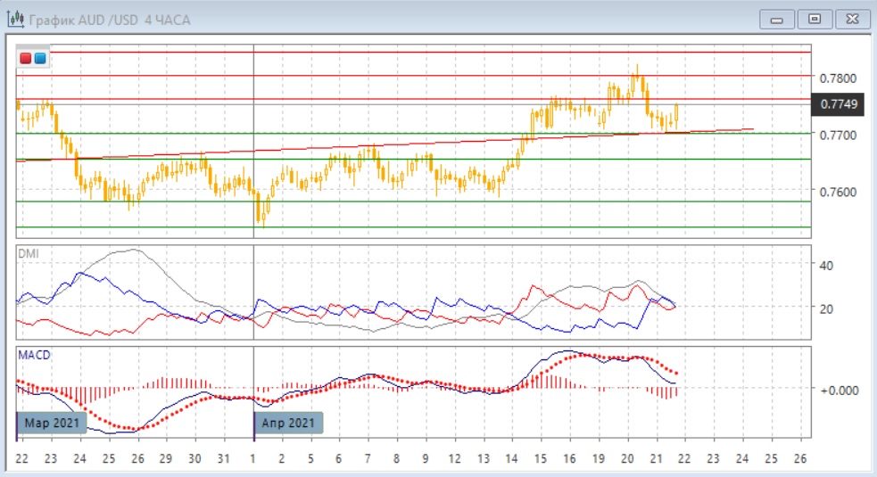 На дневном графике пара достигла пара снизилась после тестирования сильного сопротивления на 0,7800. При этом при откате пара получила поддержку на точке сочетания ближайшего "круглого" уровня 0,7700 и "линии шеи" модели голова-плечи в январе-марте. Пара остаётся выше этой линии, и ситуация остаётся бычьей. Последовательность роста относительных максимумов и минимумов пары после разворота в начале апреля сохраняется. По индикаторам направленного движения тенденцией является рост: DM+ выше DM-, уровень ADX вырос, гистограмма MACD находится в положительной зоне, линия MACD имеет положительный наклон. Более вероятно, что рост будет продолжаться.