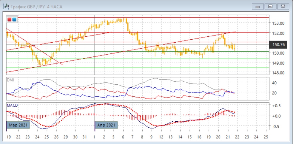 На четырёхчасовом графике пара снизилась от уровня сопротивления 152,00 и линии тренда. Снижение во вторник было относительно резким, и пара вернулась к уровню поддержки 150,00. Сейчас она находится в диапазоне 8-13 апреля. Ситуация скорее нейтральная, так как поддержка на 150,00 сильная, и быстрое снижение от 152,00 показывает, что устойчивой поддержки для роста сейчас нет. Более долгосрочно снижение является предпочтительным, так как рост с 16 апреля можно рассматривать как коррекцию к снижению с 6 апреля - в этом случае, завершение коррекции привело бы к преодолению уровня 150,00.