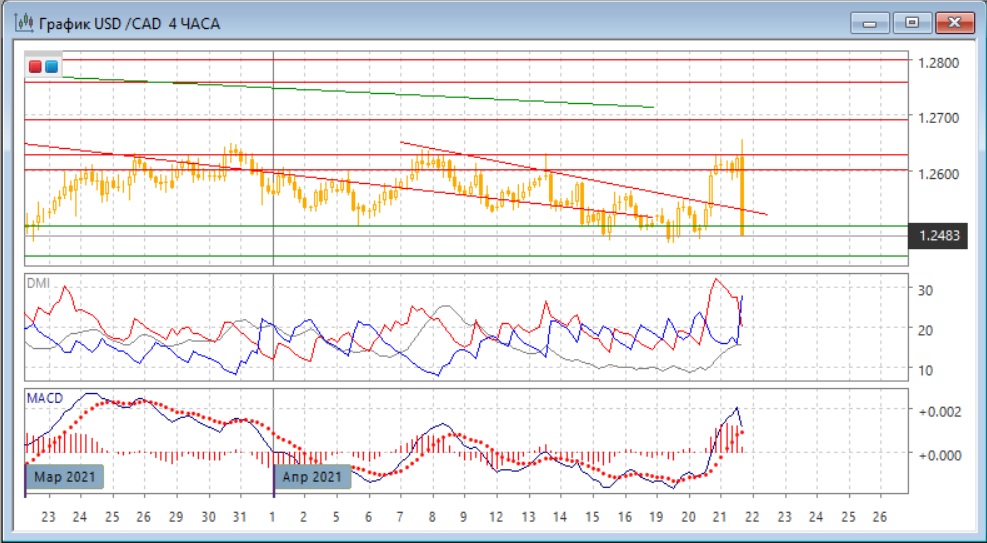 На четырёхчасовом графике снижение пары ещё более резкое, чем на дневном. Это вызванное фундаментальным изменением снижение, вероятно, будет продолжаться, так как пара может выйти сейчас из консолидации, которая продолжатся в течение апреля - выше 1,2500, но ниже зоны 1,2600-1,2630. То, что снижение было сильным, и не было быстрого отскока после очень сильного движения, скорее говорит о том, что это скорее не случайное колебание, вызванное новостями.