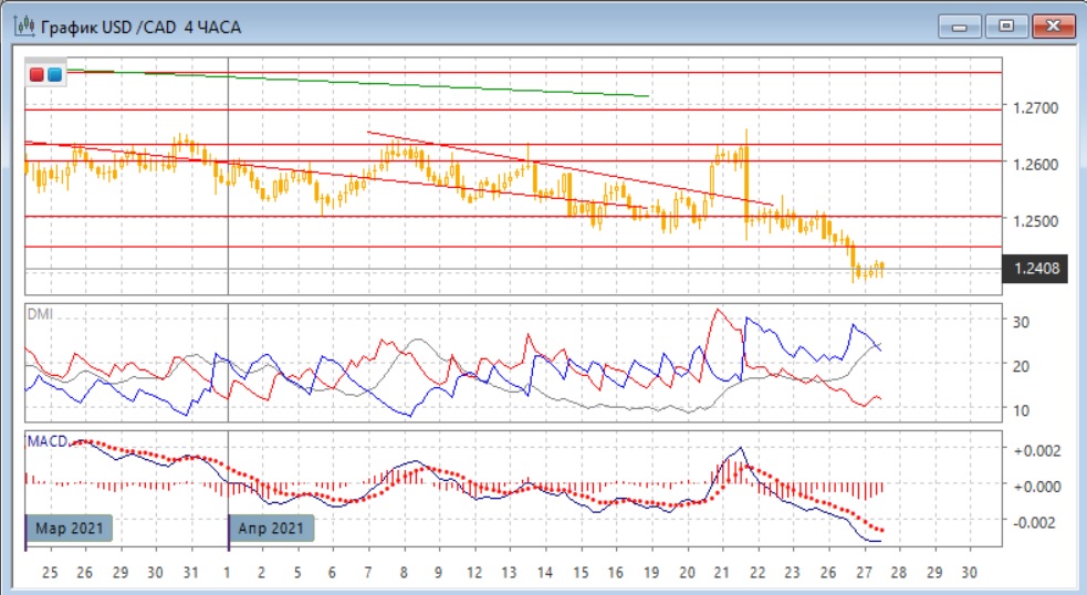 На четырёхчасовом графике пара продолжила снижение после консолидации ниже уровня 1,2500. Сейчас происходит небольшая консолидация выше следующего "круглого" уровня 1,2400. Отскок от 1,2400 слабый, и скорее это показывает силу тенденции снижения сейчас, и снижение скорее всего продолжится. По индикаторам направленного движения тенденцией также является снижение: сохраняется превышение DM- над DM+, уровень ADX вырос, гистограмма MACD находится в отрицательной зоне, линия MACD имеет отрицательный наклон.