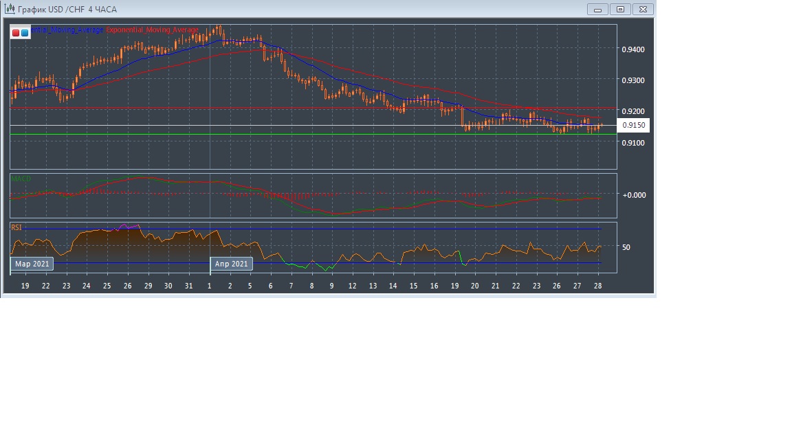 На четырёхчасовом графике скользящие средние с периодом 21 и 55 дней продолжают двигаться вниз, но замедляются и по-прежнему сохраняют стабильное расхождение, что говорит о продолжении медвежьего тренда. Таким образом, общий тренд в краткосрочной перспективе и на сегодня остаётся нисходящим. График котировок прогрессирует в области ниже экспоненциальных скользящих средних, подтверждая медвежий потенциал данного рынка в краткосрочной перспективе.