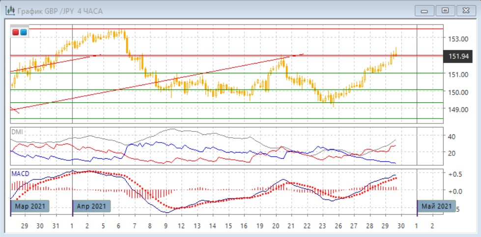 На дневном графике пара преодолела уровень сопротивления 151,00. Сейчас вместо разворота к снижению ситуация больше похожа на диапазон, если рассматривать его с марта границы можно определить 148,40-153,50. Пара преодолела предыдущий относительный максимум, это нарушило последовательность снижения. Размер текущей волны роста от 149,35 для диапазона уже значительный, и может последовать откат даже при сохранении роста внутри диапазона.
