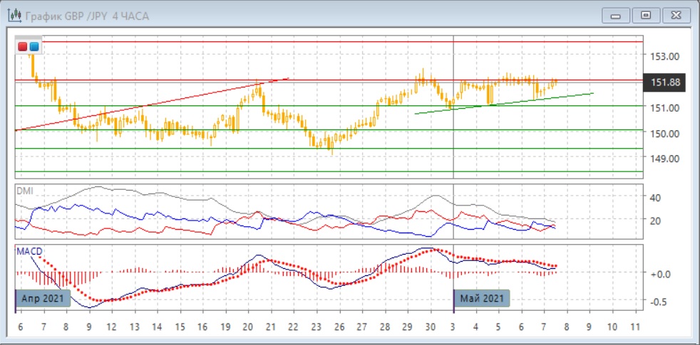 На четырёхчасовом графике пара тестирует верхнюю границу диапазона в мае 151,00-152,00. Также можно рассматривать движение с начала мая как направленный вверх треугольник, так как относительные минимумы растут. Исходя из движения в диапазоне и в треугольнике, можно ожидать снижения к нижним границам, так как пара уже достигла верхней. В более широкой перспективе более вероятен выход из этих фигур вверх, так как это будет продолжением тенденции роста с конца апреля после консолидации. По индикаторам направленного движения в этом масштабе флэт: DM+ и DM- близки, ADX снижается, гистограмма MACD остаётся около нулевого уровня.