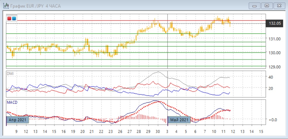 На четырёхчасовом графике, возможно, образуется ещё одна вершина около 132,25. Выше пара не закрепилась, и относительные максимумы и минимумы теперь снижаются. При откате поддержка может быть на 131,30, как в начале мая.