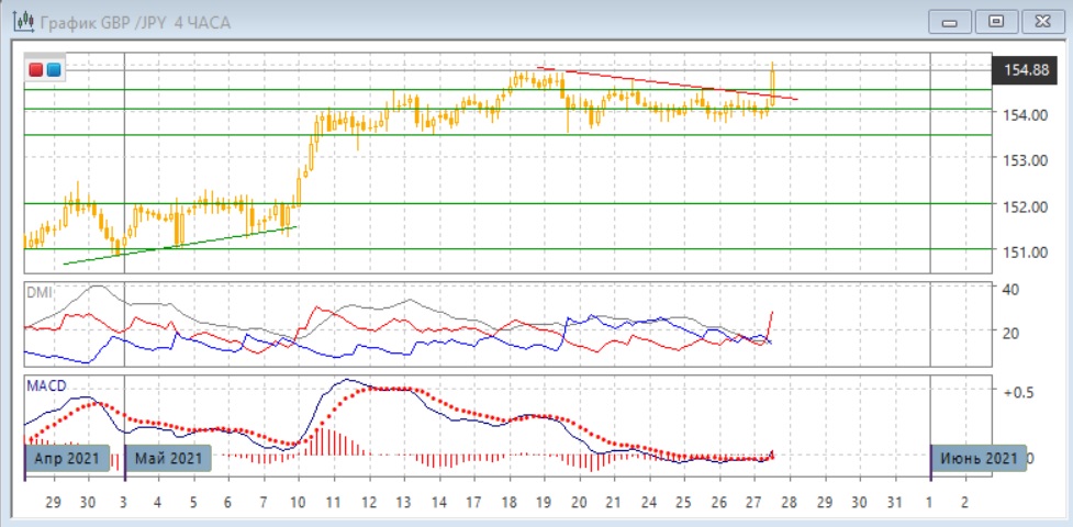 На четырёхчасовом графике пара преодолела краткосрочную линию тренда с 19 мая. Резкий прорыв вверх делает предпочтительным продолжение роста в краткосрочной перспективе, и, учитывая более долгосрочную тенденцию, размер роста может быть для этого масштаба относительно большим. Пара, вероятно, останется выше верхней границы диапазона 153,50-154,45. Исходя из его размера в 95 пунктов, ближайшей целью измеренного движения является 155,40. Пара уже достигла ближайшего сопротивления на уровне максимумов 18-19 мая, но этот уровень, скорее всего, будет преодолён. По индикаторам направленного движения флэт закончился: DM+ существенно выше DM-, гистограмма MACD выросла в положительной зоне.