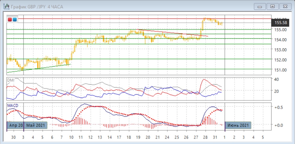 На четырёхчасовом графике происходит коррекция к росту, пара снижается от следующего "круглого" уровня 156,00. Пока размер снижения относительно небольшой для размера волны роста от 154,00, и откат не выходит за пределы коррекции. Более вероятно, что рост возобновится. По индикаторам направленного движения коррекция к росту: DM+ остаётся выше DM-, но гистограмма MACD снижается и линия MACD развернулась.