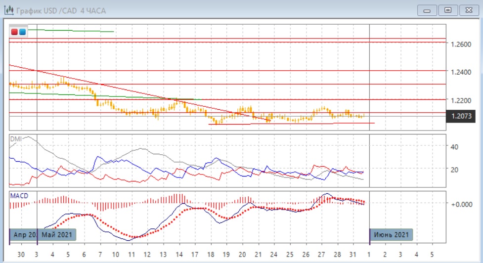 На четырёхчасовом графике пара остаётся ниже сопротивления на 1,2100 после пары попыток прорыва вверх. Пара находится в узкой консолидации ниже 1,2100, и сейчас более вероятно снижение ниже этого уровня, так как разворота вверх, похоже, не произошло. Относительные максимумы пары теперь снижаются. По индикаторам направленного движения пара во флэте: DM+ и DM- близки, ADX на низком уровне, гистограмма MACD около нулевого уровня. Целью снижения может быть линия тренда по минимумам мая, которая находится сейчас около 1,2030.
