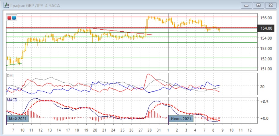 На дневном графике пара вернулась к уровню поддержки 155,00, у максимума в середине мая. Сейчас она остаётся ниже этого уровня, и с начала июня относительные максимумы и минимумы пары уже снижаются. Ближайшая поддержка на 154,45, и этот уровень в мае чаще выступал сопротивлением. Дальнейшее движение сейчас, вероятно, будет в сторону либо возвращения выше 155,00, либо преодоления уровня 154,45. По индикаторам направленного движения - коррекция к росту: превышение DM+ над DM- сохраняется, но гистограмма MACD в отрицательной зоне, линия MACD получила отрицательный наклон.