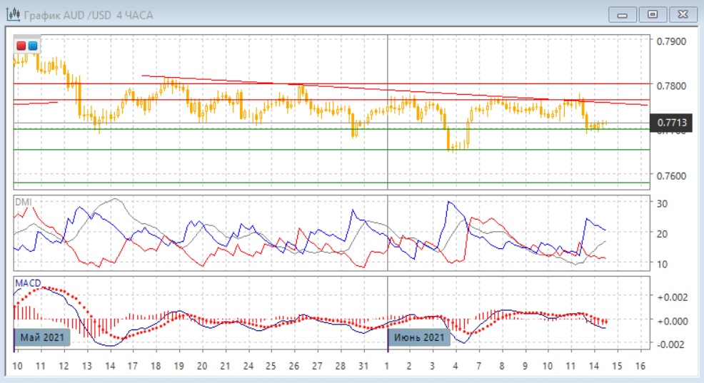 На четырёхчасовом графике пара при снижении получила поддержку на нижней границе канала на 0,7700, однако после резкого снижения 11 июня коррекция была незначительной. Пара продолжает тестировать "круглый" уровень 0,7700. Это, вероятно, показывает отсутствие поддержки для роста в настоящий момент, уровень 0,7700 скорее будет преодолён. Ниже 0,7700 целью видится уровень 0,7650, около минимумов 3-4 июня.