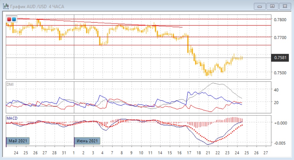 На четырёхчасовом графике продолжается тестирование уровня 0,7580, пока оно не было успешным. Верхние тени свечей выше 0,7580 показывают, что рост быстро продаётся. Дальнейшая перспектива, вероятно, будет зависеть от того, куда будет двигаться пара: снижаться от 0,7580, или же уровень будет преодолён. При снижении можно ожидать отката к ближайшему "круглому" уровню 0,7500, при росте целью виделся бы уровень 0,7650, близкий к относительному минимуму 3-4 июня.