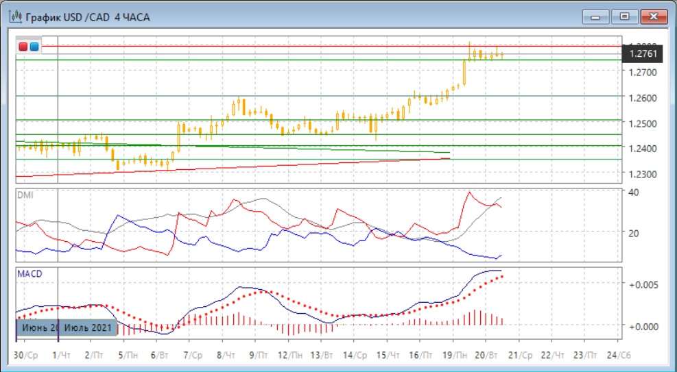 На четырёхчасовом графике происходит консолидация после сильного роста в границах 1,2740-1,2800. Более вероятный выход из неё вверх, так как "флаг" - фигура продолжения. Отсутствие снижения после образования большой "падающей звезды" в понедельник также может быть бычьим сигналом, так как медвежий сигнал не сработал. По индикаторам направленного движения в этом масштабе тенденция роста также сильная: превышение DM+ над DM- очень большое, ADX на высоком уровне и растёт, гистограмма MACD в положительной зоне, линия MACD имеет положительный наклон.