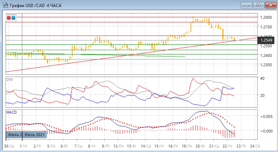 На четырёхчасовом графике пара вернулась к линии восходящего тренда в июле после отскока от него в среду. Сопротивлением при отскоке выступил ближайший "круглый" уровень 1,2600. Сейчас кажется, что линия тренда будет преодолена, так как поддержки для роста хватило даже для заметной коррекции после очень сильного снижения (от 1,2800 размер снижения составил почти 300 пунктов, что много для пары). Дальнейшая перспектива, вероятно, будет определяться тем, преодолеет ли пара линию тренда и находящийся рядом психологически важный уровень 1,2500. При преодолении линии тренда снижение облегчилось бы, но от важного уровня 1,2500 возможен отскок.