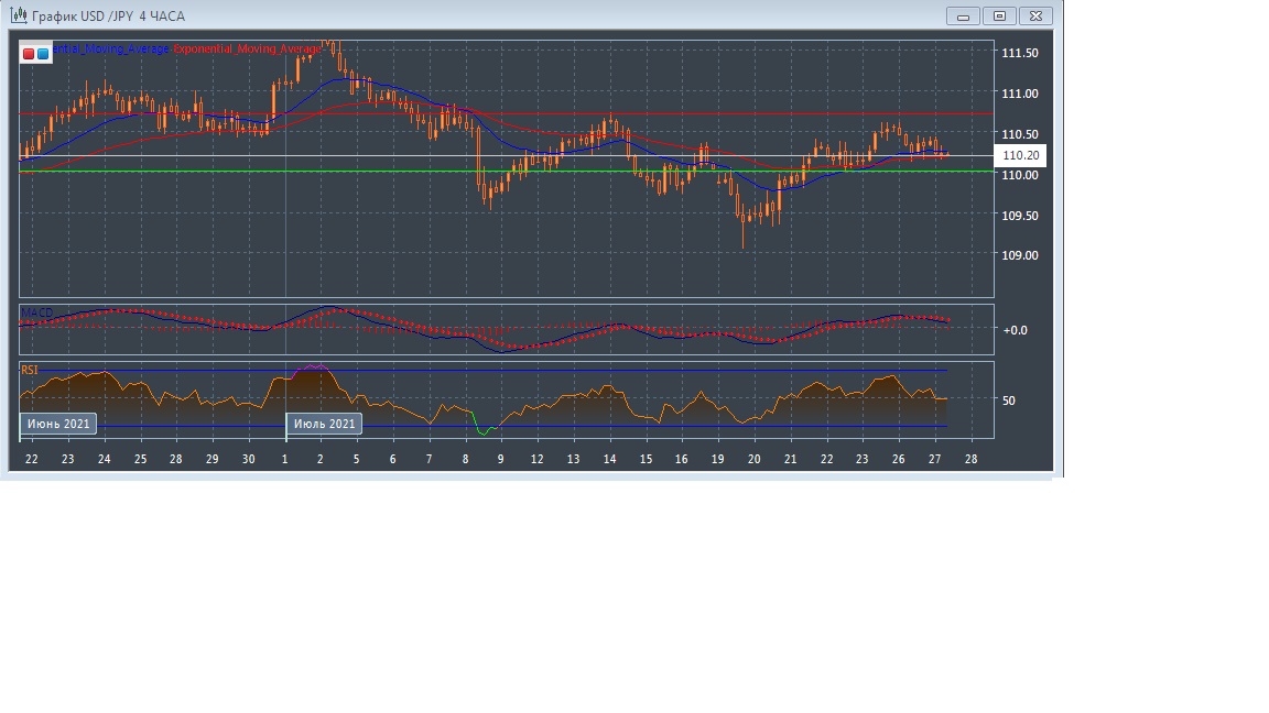 Скользящие средние с периодом 21 и 55 дней продолжают движение, но существенно замедлились, сокращая расхождение, что демонстрирует потерю преимущества быками на этом рынке в краткосрочной перспективе. Четырёхчасовой график вышел в область между экспоненциальных скользящих средних, что так же говорит нам о нейтральном потенциале этого рынка сегодня.