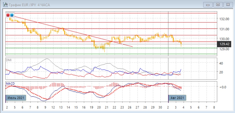 На четырёхчасовом графике пара вышла вниз из диапазона 129,60-130,30. Теперь продолжение снижения кажется предпочтительным. Консолидация в узком диапазоне почти 2 недели создаёт возможность относительно большого по размеру движения, когда пара вышла из диапазона. По индикаторам направленного движения тенденцией становится снижение: DM- выше DM+, гистограмма MACD снижается в отрицательной зоне, линия MACD получила отрицательный наклон.