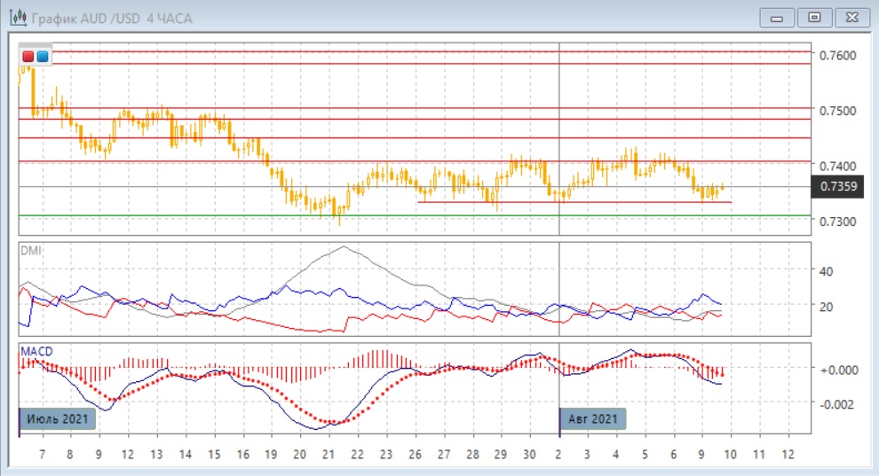 На четырёхчасовом графике пара при откате от 0,7400 получила поддержку на уровне 0,7330, около которое образовалось несколько минимумов с 26 июля. Так как отскока вверх пока не происходит, уровень 0,7330 может быть преодолен. Но в целом пара находится перед сильной зоной поддержки из уровня 0,7330 и "круглого" уровня 0,7300, поэтому вероятность роста, оставаясь в диапазоне, высока. В более широкой картине медвежьим сигналом являются ложные пробои уровня 0,7400. Это увеличивает вероятность выхода из диапазона 0,7300-0,7400 вниз.