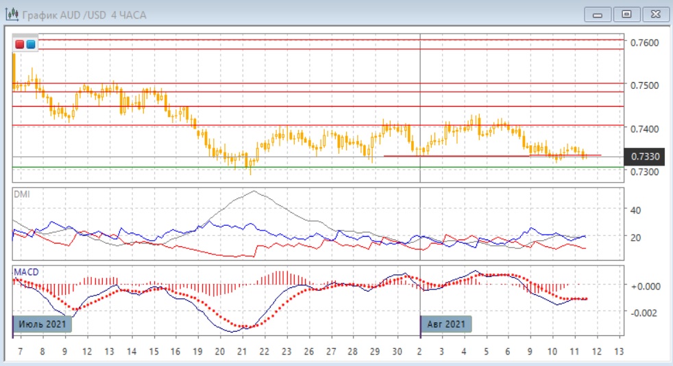 На четырёхчасовом графике пара не выросла от уровня поддержки 0,7330 (нижняя граница более узкого канала). Это, скорее, медвежий сигнал, и пара в ближайшей перспективе может тестировать уровень 0,7300. Относительных максимумы пары в этом масштабе снижаются. DM- сейчас устойчиво выше DM+. Хотя в целом пара остаётся в диапазоне, и вероятность отскока вверх от 0,7300 велика, так как это сильный уровень поддержки, и ближайшей перспективе снижение кажется предпочтительным.