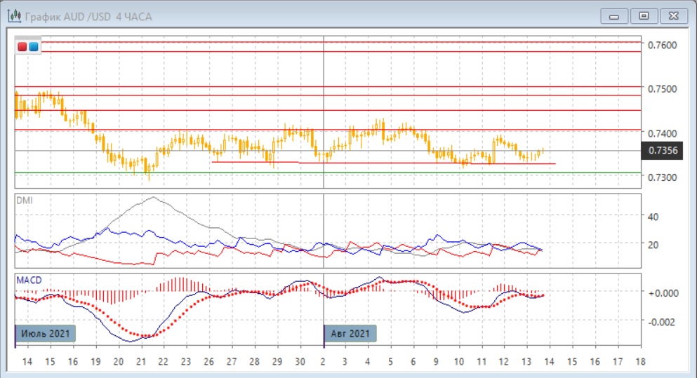 На четырёхчасовом графике пара консолидируется выше 1,2500 в очень узком диапазоне 1,2500-1,2540. Дальнейшее движение, вероятно, будет в сторону выхода из этого диапазона. немного более предпочтительным явления снижение, так как с 10 августа относительные максимумы пары снижаются. По индикаторам направленного движения в этом масштабе флэт: DM+ и DM- близки, ADX на низком уровне, гистограмма MACD около нуля, линия MACD почти горизонтальна. Само образование ряда близких к "дожи" свечей показывает нейтральное состояние на данный момент.